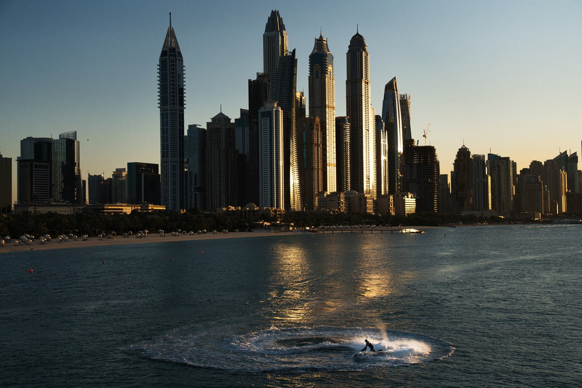 A jet ski races around in a circle as the Dubai Marina is seen in the background in Dubai, United Arab Emirates, Saturday, Dec. 21, 2019. (AP Photo/Jon Gambrell)