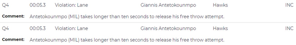 “Violation: Lane. Antetokounmpo (MIL) takes longer than ten seconds to release his free throw attempt. INC” αναφέρει η έκθεση, η οποία εξηγεί πως οι διαιτητές κακώς δεν χρέωσαν τον MVP του 2019 και του 2020 με παράβαση 10 δευτερολέπτων και στην πρώτη και στη δεύτερη βολή. Μένει να δούμε τι θα συμβεί στη συνέχεια της σειράς, με τον Αντετοκούνμπο να δέχεται πλέον πολλή πίεση, την ώρα που και οι διαιτητές καλούνται να συμμορφωθούν με τους κανονισμούς.