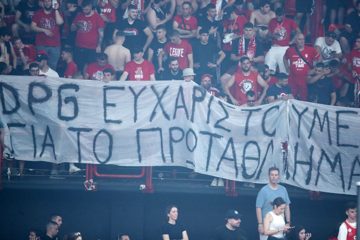 Ο Ολυμπιακός κατέκτησε το 15ο πρωτάθλημα της ιστορίας του και οι φίλοι των ερυθρόλευκων ύψωσαν πανό με το οποίο ευχαρίστησαν για αυτό τον Δημήτρη Γιαννακόπουλο.