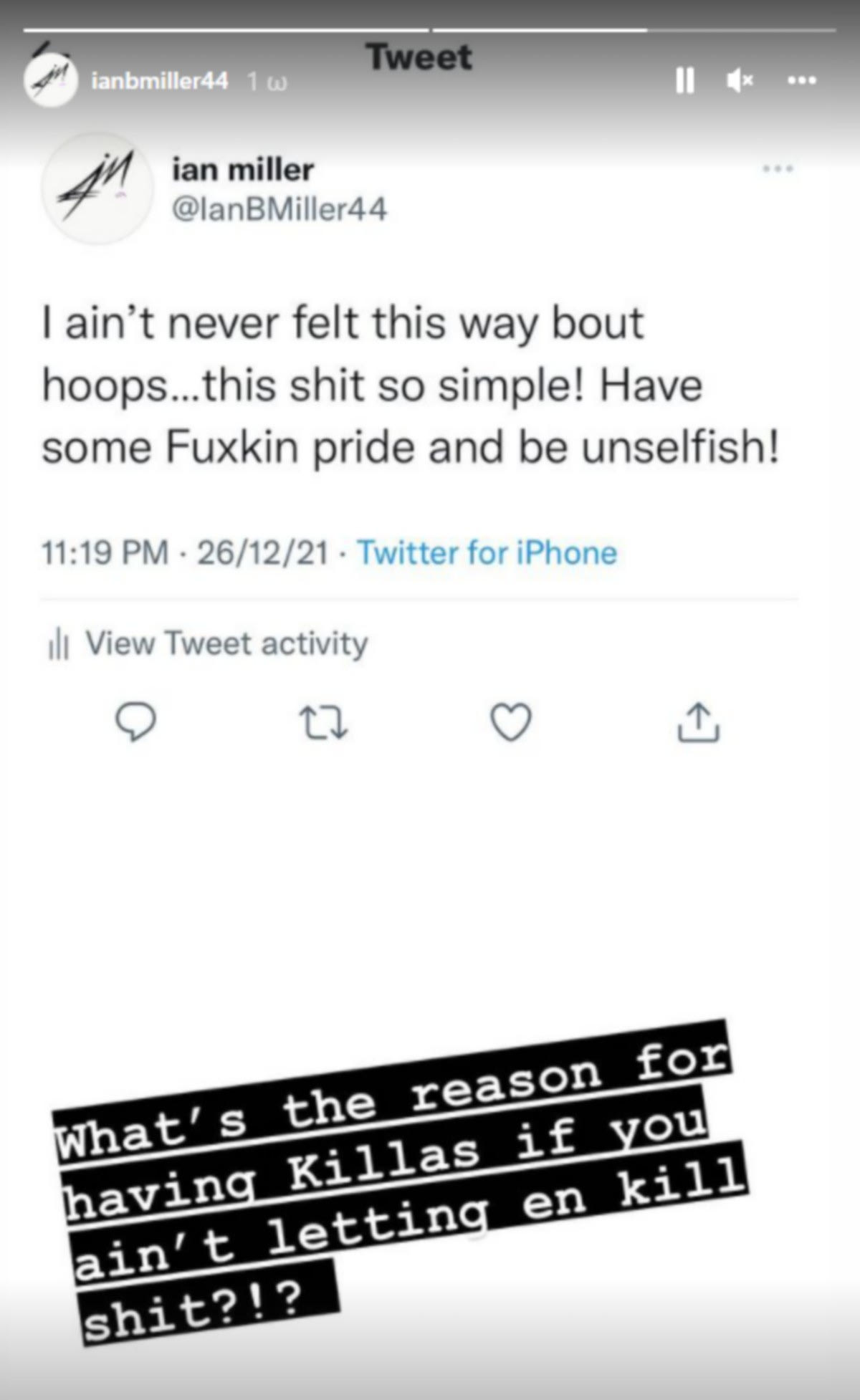 “Δεν έχω ξανανιώσει έτσι για το μπάσκετ. Τόσο απλά. Έχε λίγη γ@μ….νη περηφάνια, μην είσαι εγωιστής” έγραψε ο Αμερικανός σκόρερ στο Twitter, πριν προσθέσει σε story την ατάκα “ποιος ο λόγος να έχεις “δολοφόνους” στην ομάδα σου αν δεν τους αφήνεις να κάνουν ζημιά;“.