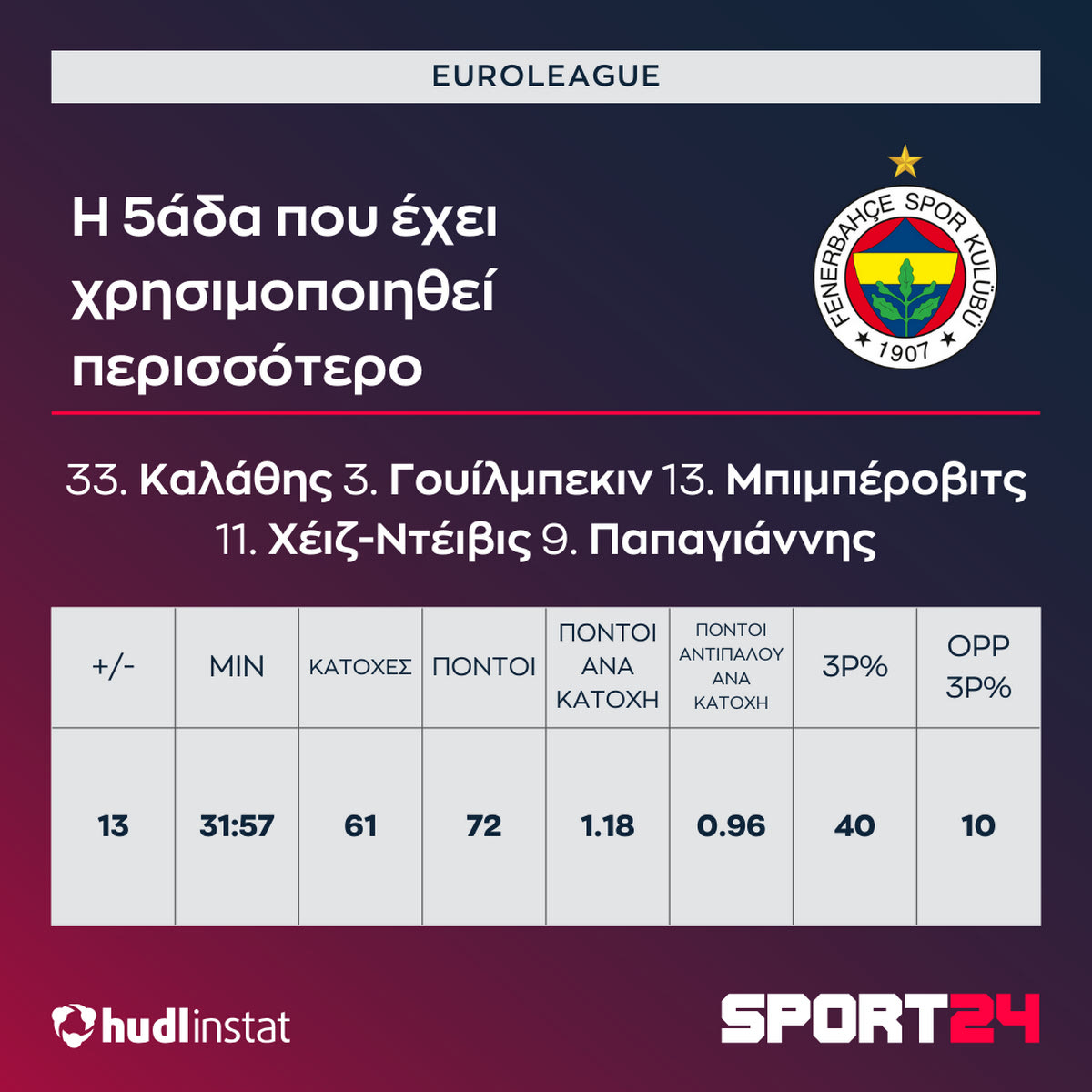 Είναι κάτι παραπάνω από σαφές ότι η τριάδα των Καλάθη, Γουίλμπεκιν και Χέιζ-Ντέιβις είναι αυτή που ορίζει τις ισορροπίες στην Φενέρ. Η απόδειξη για αυτό είναι ότι – επί θητείας Γιασικεβίτσιους – έχουν συνυπάρξει σε 23 διαφορετικές πεντάδες και συνολικά 219 λεπτά και 54 δευτερόλεπτα. Καθόλου τυχαία, έχουν συνυπάρξει και σε δύο από τις πιο σημαντικές πεντάδες της Φενέρ.