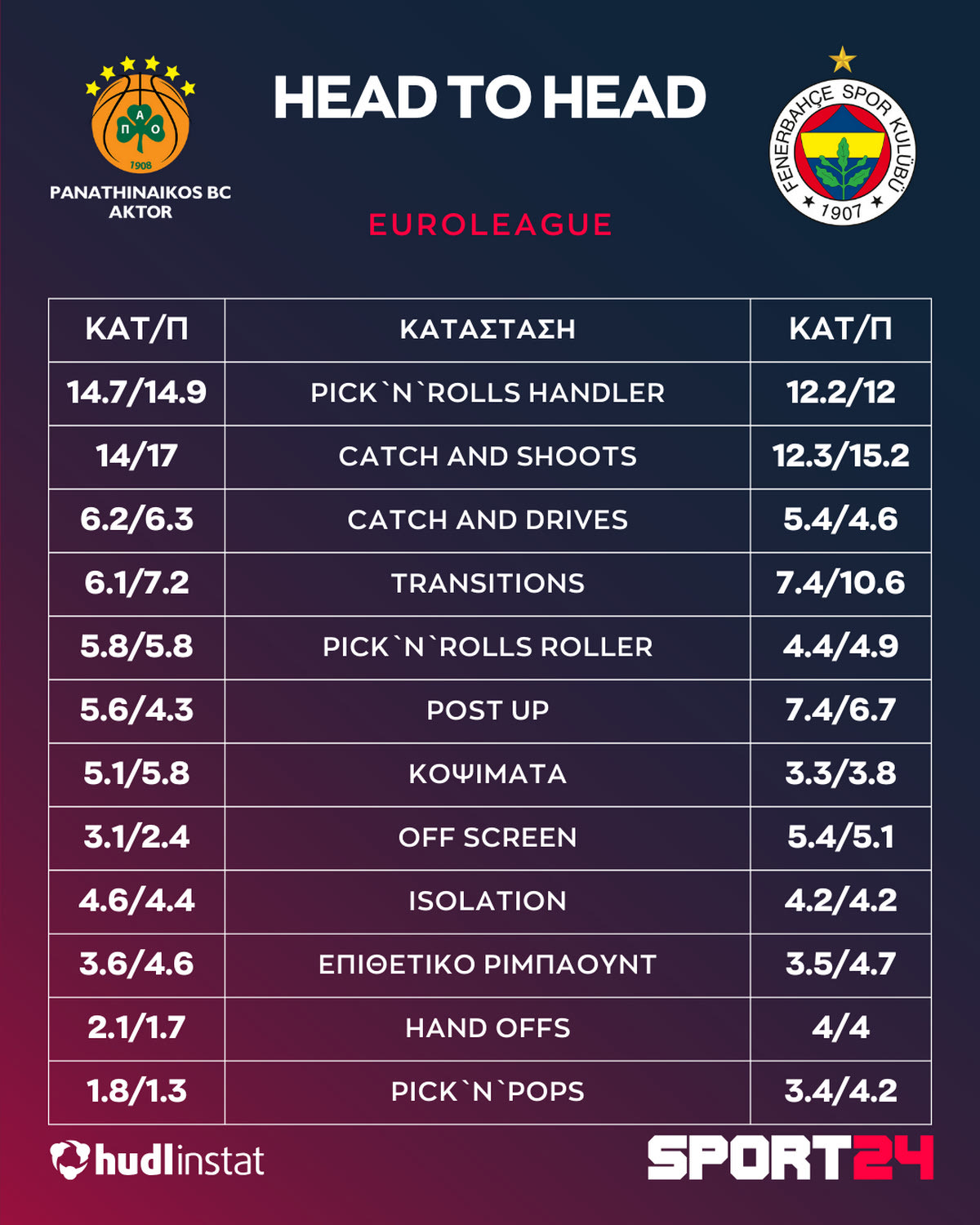 Ακόμα μεγαλύτερη απόδειξη ωστόσο είναι ότι η Φενέρ γενικά… τρέχει (κάτι που ο Σάρας σχεδόν είχε… απαγορεύσει σε Μπαρτσελόνα και Ζάλγκιρις), παίρνοντας 10.6 πόντους στο ανοιχτό γήπεδο (7η καλύτερη επίδοση στην EuroLeague). Το τελευταίο είναι κάτι που σαφώς πρέπει να ληφθεί υπόψη από τον Παναθηναϊκό AKTOR, αφού σύμφωνα με το Hudl Instat οι “πράσινοι” έχουν την 3η χειρότερη άμυνα στο transition (κατάσταση αιφνιδιασμού) στην EuroLeague, δεχόμενοι 10.8 πόντους ανά αγώνα.