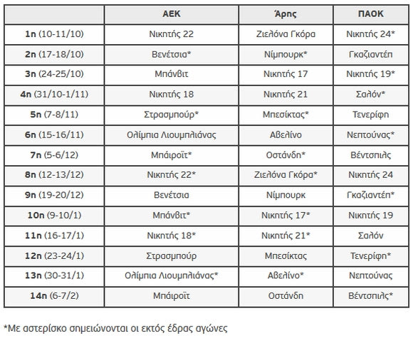 Αναλυτικά το πρόγραμμα των αγώνων των τριών ελληνικών ομάδων: