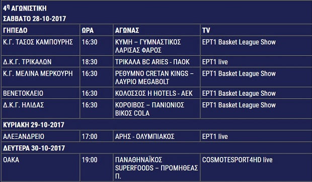 Πέντε αγώνες περιέχει το πρόγραμμα της 4ης αγωνιστικής στη Stoiximan.gr Basket League, η οποία θα διεξαχθεί ανήμερα της εθνικής εορτής της 28ης Οκτωβρίου. Μία ημέρα αργότερα (29/10) θα διεξαχθούν οι αγώνες με τους οποίους θα ολοκληρωθεί η 4η αγωνιστική, το Αρης-Ολυμπιακός και το Παναθηναϊκός-Προμηθέας.