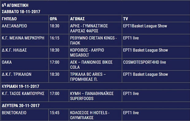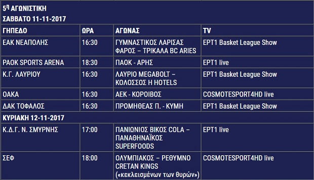Ο ΕΣΑΚΕ ανακοίνωσε σήμερα επίσης το αναλυτικό πρόγραμμα της 5ης και της 6ης αγωνιστικής, οι οποίες θα γίνουν στις 11-12 Νοεμβρίου και το τριήμερο 18-20 Νοεμβρίου αντίστοιχα.