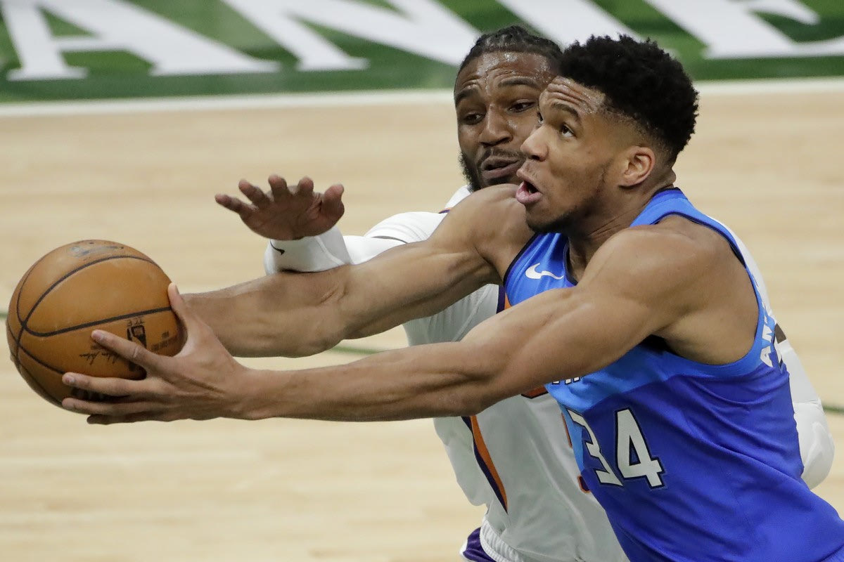 Γιάννης Αντετοκούνμπο και Τζέι Κράουντερ σε φάση από αγώνα Μπακς - Σανς τον Απρίλιο του 2021 2021 AP Photo/Aaron Gash