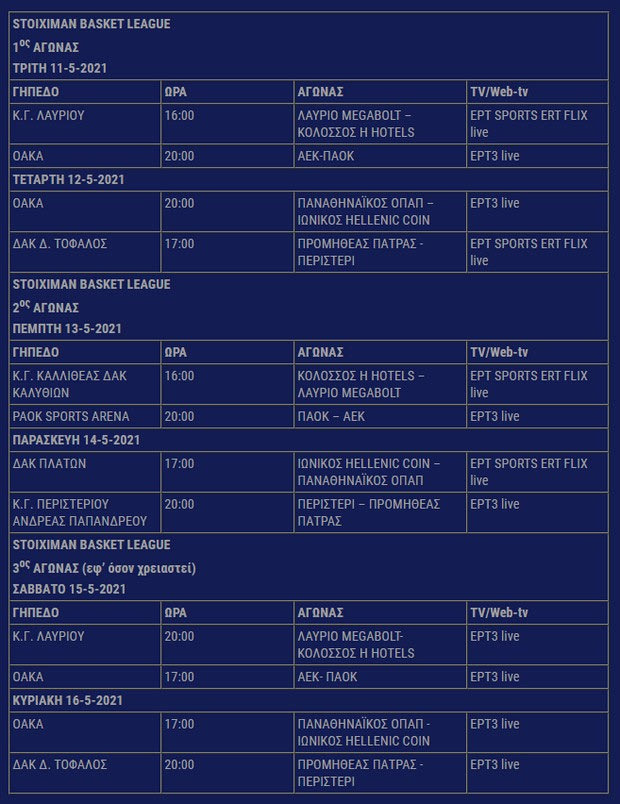Οι αγώνες θα ξεκινήσουν την Τρίτη 11/5 με τα ζευγάρια Λαύριο – Κολοσσός (16:00) και με ΑΕΚ – ΠΑΟΚ (20:00) και θα συνεχιστούν την Τετάρτη 12/5 με τα ζευγάρια Προμηθέας – Περιστέρι (17:00) και Παναθηναϊκός – Ιωνικός (20:00).
