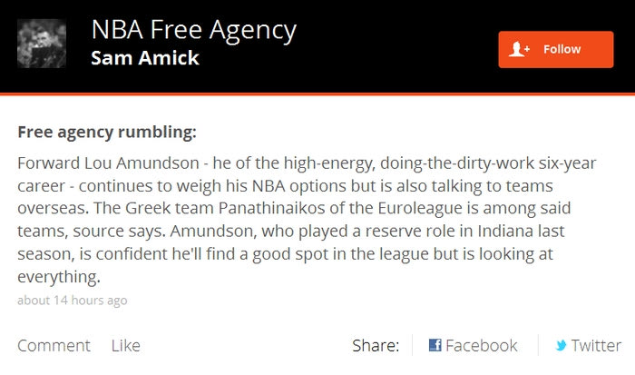 Η ελληνική ομάδα του Παναθηναϊκού που αγωνίζεται στην Ευρωλίγκα είναι μία από αυτές. Ο Άμουντσον, ο οποίος είχε ρόλο αναπληρωματικού πέρυσι στην Ιντιάνα, είναι αισιόδοξος ότι θα καταφέρει να βρει μία καλή θέση σε μία ομάδα, αλλά αφήνει όλες τις επιλογές του ανοικτές“.