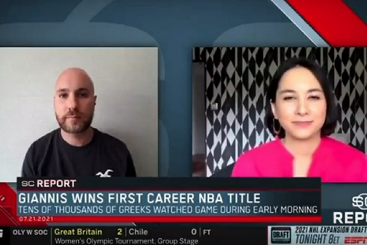 Το μεσημέρι της Τετάρτης (21/7) ο απεσταλμένος του SPORT24 στις ΗΠΑ, Χάρης Σταύρου, φιλοξενήθηκε στην θρυλική αθλητική εκπομπή SportCenter του ESPN, με την δημοσιογράφο Μισέλ Στιλ να προσπαθεί να μάθει το πως αντιμετωπίζεται ο Greek Freak στην πατρίδα του και πως αντέδρασε ο κόσμος που δεν παρακολούθησε το Game 6 των NBA Finals μόλις ξύπνησε και έμαθε ότι οι Μπακς κατέκτησαν τον τίτλο με σκορ 4-2.