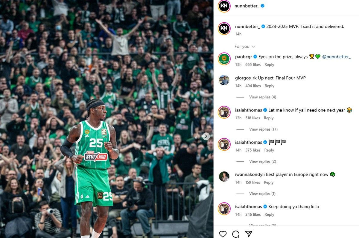 Στην ανάρτηση του Κέντρικ Ναν στο Instagram μετά την ανάδειξή του σε MVP της EuroLeague δεν σχολίασε μόνο ο κόσμος του Παναθηναϊκού, αλλά και ο Αϊζέια Τόμας. Ο 36χρονος γκαρντ, που πλέον αγωνίζεται στους Σολτ Λέικ Σίτι Σταρς στην G-League, έγραψε: “Ενημερώστε με αν χρειάζεστε έναν ακόμα την επόμενη χρονιά”.