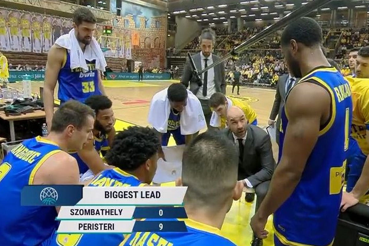 Παρά το γεγονός πως το Περιστέρι bwin είχε το προβάδισμα και μια τελευταία κατοχή, ο Βασίλης Σπανούλης πήρε τάιμ άουτ λίγα δευτερόλεπτα πριν από το τέλος της πρώτης περιόδου. Ο λόγος; Η βιαστικές επιλογές των παικτών του, που έδωσαν τη δυνατότητα στην Σομπατέλι να βάλει δύο γρήγορα καλάθια.