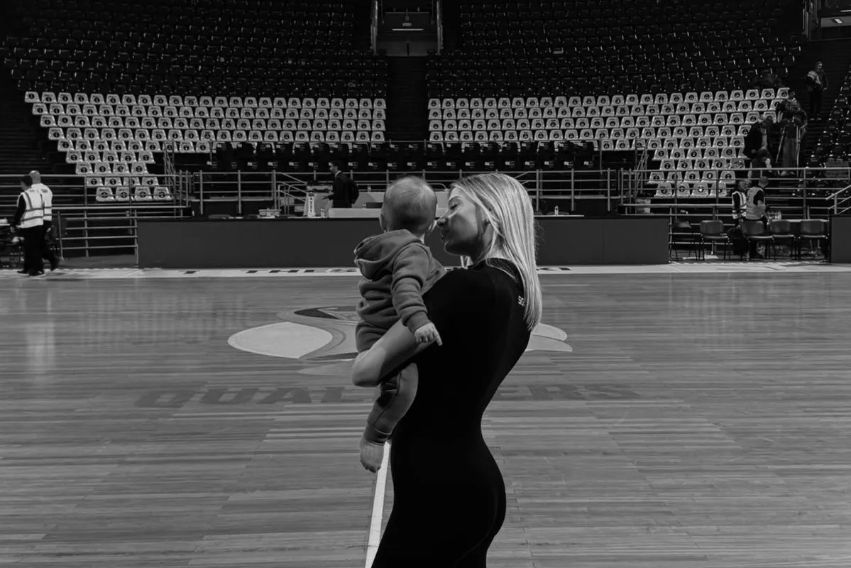 Στις φωτογραφίες, η Μαρία ποζάρει στο παρκέ κρατώντας στην αγκαλιά τον μόλις πέντε μηνών γιο τους, ο οποίος, αν και τόσο μικρός, φαίνεται να έχει ήδη εξοικειωθεί με την ατμόσφαιρα του μπάσκετ, αφού δεν είναι η πρώτη φορά που παρακολουθεί τον μπαμπά του στο παρκέ.
