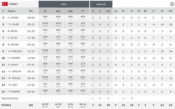 Τουρκία (Αταμάν): Οσμάν, Γκιουλέρ 16, Ερμίς, Ακιόλ 7 (1), Ερσέκ, Πρέλτζιτς 16 (3), Τουντσερί 6 (2), Σαβάς 1, Γκονλούμ 4, Αρσλάν 11 (3), Ασίκ 4, Αλντεμίρ.