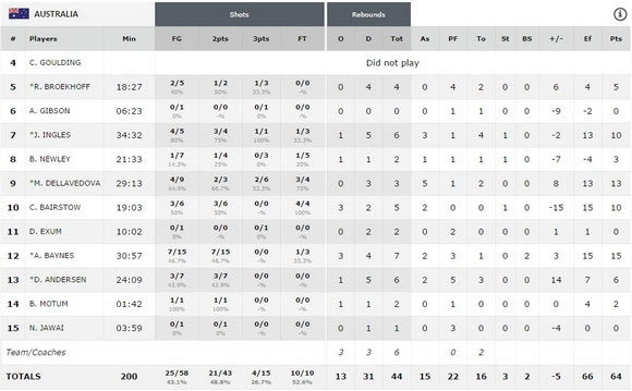 Η Αυστραλία αν και επικράτησε στη μάχη των ριμπάουντ έχοντας 44 έναντι 30 δεν κατάφερε να κερδίσει πληρώνοντας εν πολλοίς τα 16 λάθη που υπέπεσε και τα πολύ χαμηλά ποσοστά της έξω από τα 6,75μ. όπου είχε 27% έναντι 41% των Τούρκων.