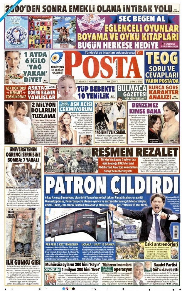 Οι μεγαλύτερες σε κυκλοφορία Τουρκικές εφημερίδες είχαν στα πρώτα θέματά τους σήμερα (26/4) την απόφαση του Δημήτρη Γιαννακόπουλου να επιστρέψει με πούλμαν ο Παναθηναϊκός από την Τουρκία λόγω του αποκλεισμού από την Φενέρμπαχτσε.