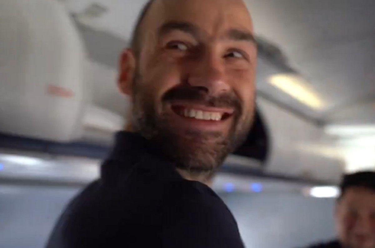 Χειροκρότημα, ευχές και τούρτα για τον Βασίλη Σπανούλη στην πτήση της επιστροφής της Εθνικής Μπάσκετ στην Ελλάδα.