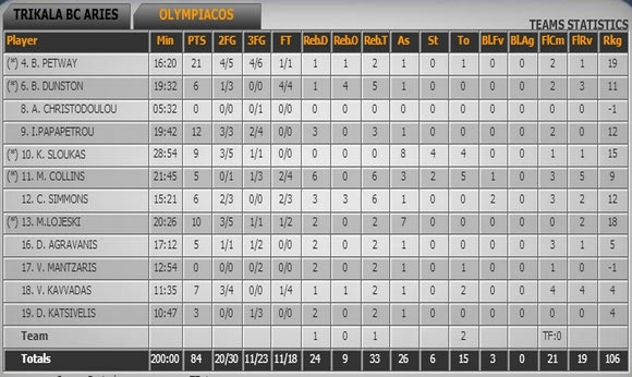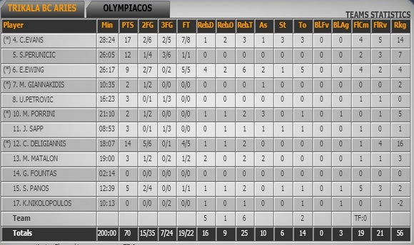 Ξεχώρισε ο φορτσάτος Πέτγουεϊ στην επίθεση (21π, 4/5δ, 4/6τρ), καλό παιχνίδι από τον Λοτζέσκι (10π, 7ασ), εξαιρετικό ματς από τον Σλούκα που έπαιξε περισσότερο απ’ όλους (28λ, 9π, 8ασ, 4κλ, 4λ), ουσιαστικός στο σκορ ο Παπαπέτρου (12π, 3/3δ, 2/4τρ), με τον Γιώργο Μπαρτζώκα να κάνει ροτέισον στην ομάδα, ξεκουράζοντας τους βασικούς του παίκτες ενόψει Εφές, χρησιμοποιώντας και τους 12 παίκτες του στην αναμέτρηση. Από τα Τρίκαλα διακρίθηκαν οι Έβανς (17π) και Δεληγιάννης (14π).