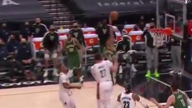 Ο “Greek Freak” βρέθηκε να μαρκάρει τον Σι Τζέι ΜακΚόλουμ και ενώ φάνηκε να τον “χάνει”, πρόλαβε να τον ακολουθήσει και να του κάνει τάπα, τρέχοντας στην συνέχεια στον αιφνιδιασμό για να καρφώσει έπειτα από ασίστ του Τζρου Χόλιντεϊ.