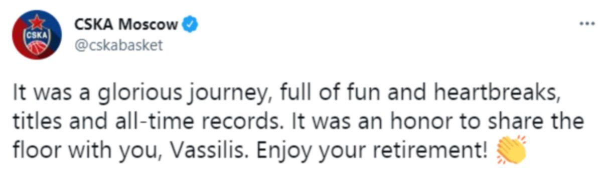 Συγκεκριμένα, η ΤΣΣΚΑ έγραψε: “Ήταν ένα σπουδαίο ταξίδι, γεμάτο χαρές και σπάσιμο καρδιών, τίτλους και ρεκόρ. Ήταν τιμή που μοιραστήκαμε το παρκέ μαζί σου, Βασίλη. Απόλαυσε την συνταξιοδότησή σου”.