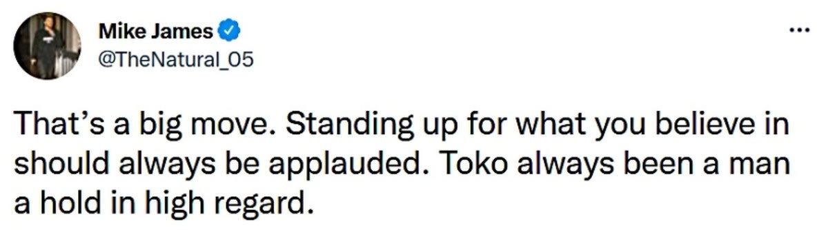 Ο Αμερικανός γκαρντ έγραψε χαρακτηριστικά: “Είναι μια τεράστια κίνηση. Το να υπερασπίζεσαι αυτό που πιστεύεις πάντα πρέπει να επικροτείται. Ο Τόκο ήταν ανέκαθεν ένας τύπος στον οποίο είχα μεγάλη εκτίμηση”.