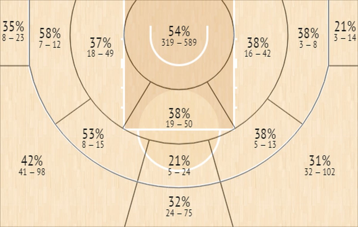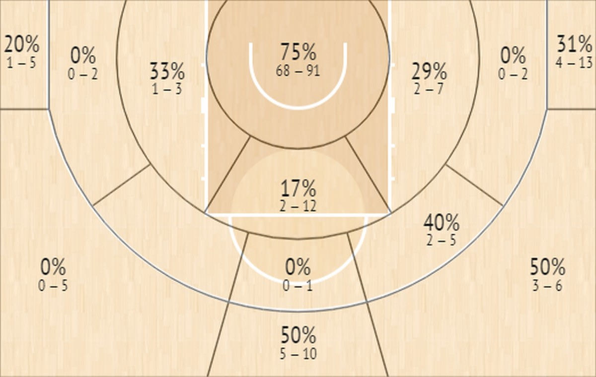 Το πόσο καλά τελειώματα έχει ο απόφοιτος του Γουέμπερ Στέιτ φαίνεται και από το τρομερό 75% που είχε την περασμένη σεζόν στα σουτ στο “ζωγραφιστό” σε όλες τις διοργανώσεις, κάτι που απεικονίζεται στο Shot Chart του από την περσινή σεζόν.