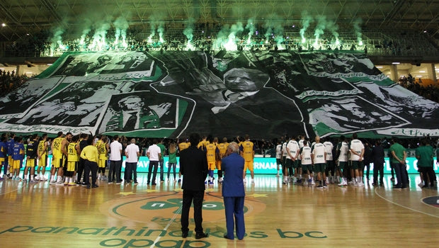Από το άνω διάζωμα της θύρας του ΟΑΚΑ έπεσε ένα τεράστιο πανό με την προσωπογραφία του Παύλου Γιαννακόπουλου περιτριγυρισμένο από έξι φωτογραφίες από κάθε Ευρωπαϊκό τρόπαιο που κατέκτησε ο Παναθηναϊκός με τον Γιαννακόπουλο στο τιμόνι.