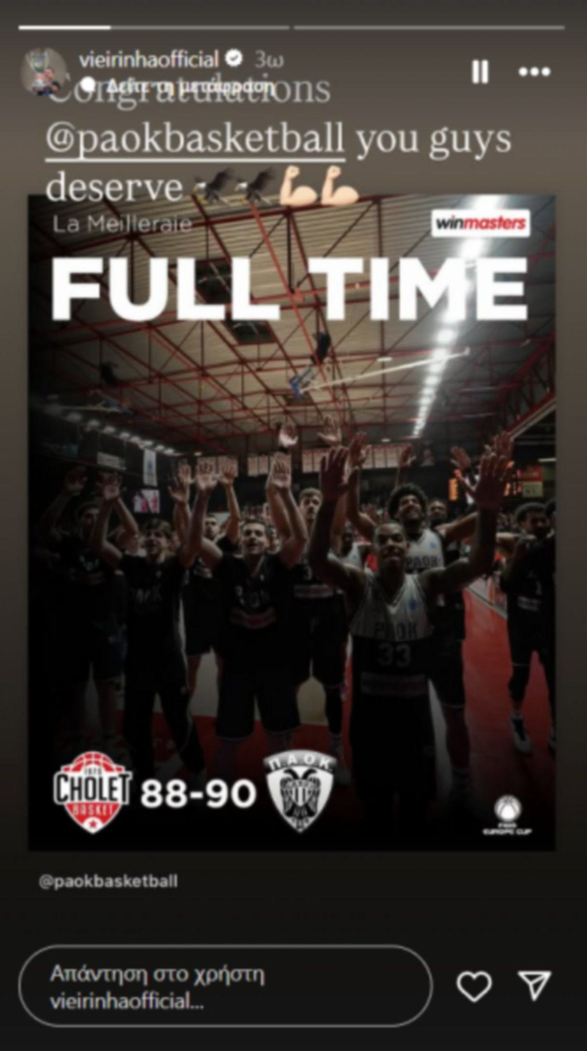 Ο Αντελίνο Βιεϊρίνια πανηγύρισε την τεράστια πρόκριση του ΠΑΟΚ στον ευρωπαϊκό τελικό, αποθεώνοντας την ομάδα μπάσκετ του Δικέφαλου μέσα από τα social media.