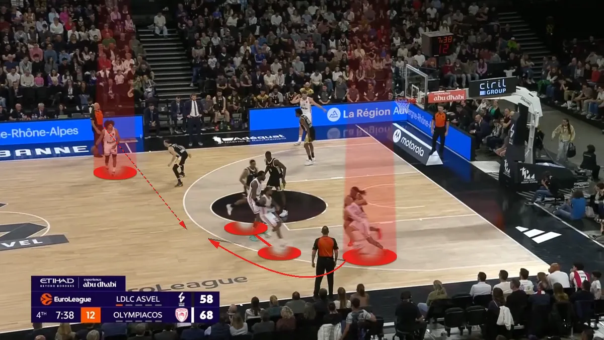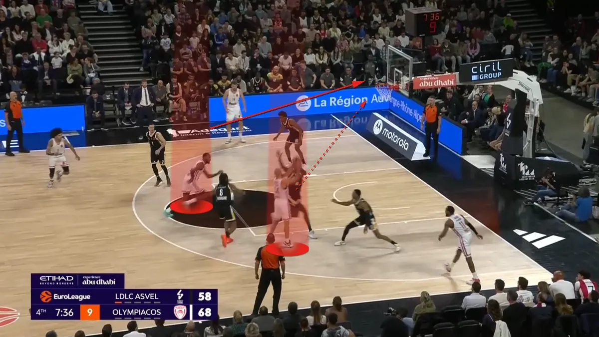 Με την άμυνα της Βιλερμπάν σε ανισορροπία (επειδή φοβήθηκε το σουτ του), ο Φουρνιέ πάει αμέσως προς το καλάθι, με τον Χολ να ρολάρει άμεσα προς την ρακέτα. Ο Μάσα αναγκάζεται να πάει προς τον Φουρνιέ.