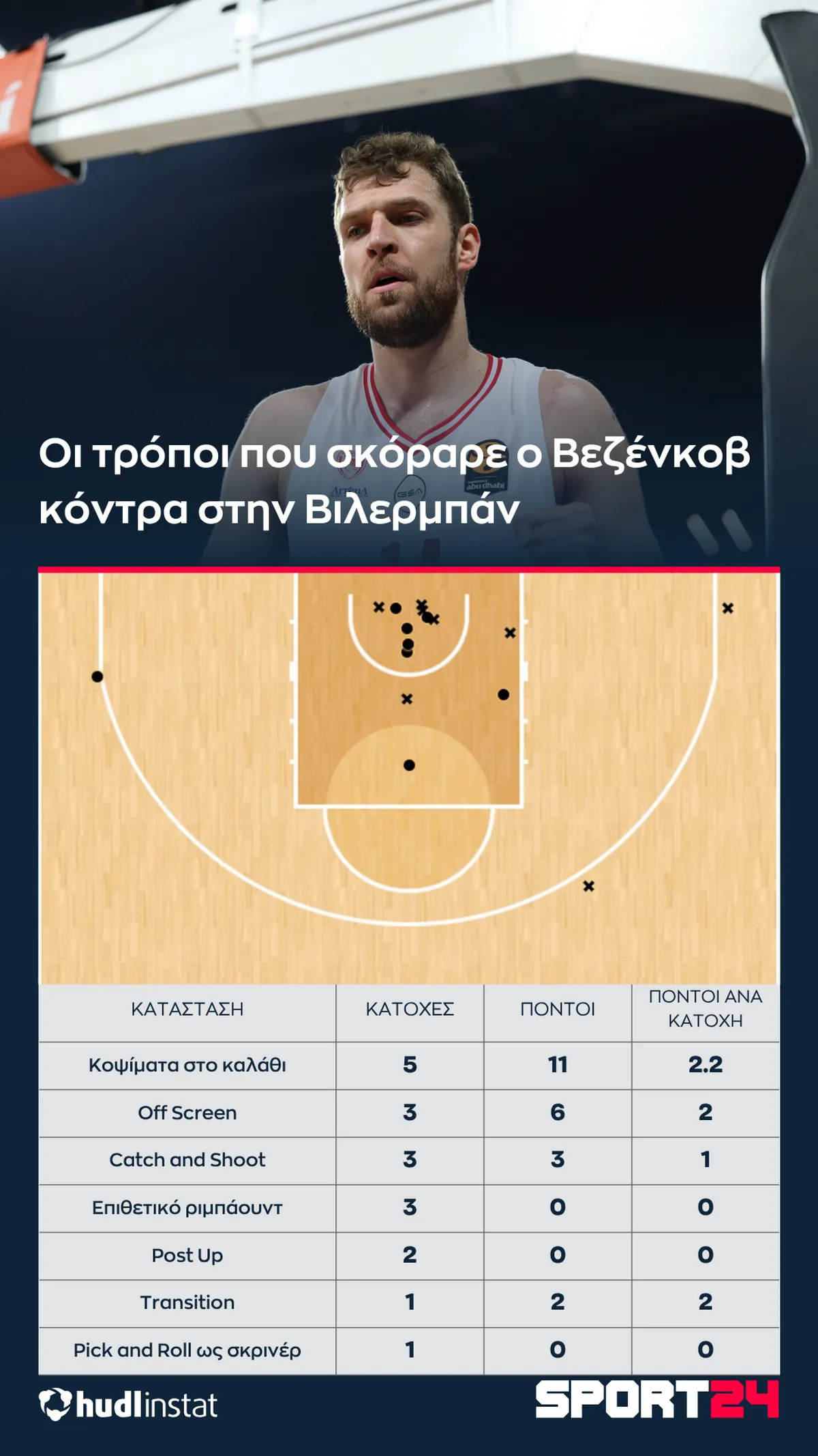Ο Βεζένκοβ είχε μία από τις πιο… Βεζένκοβ εμφανίσεις της φετινής σεζόν. Ο φόργουορντ των “ερυθρολεύκων” έκανε την περισσότερη ζημιά παίζοντας κυρίως μακριά από την μπάλα. Χαρακτηριστικό αυτού του γεγονότος είναι ότι χρειάστηκε μόλις 2 ντρίμπλες για να σημειώσει 23 πόντους, πιάνοντας συχνά στον ύπνο την άμυνα των Γάλλων.