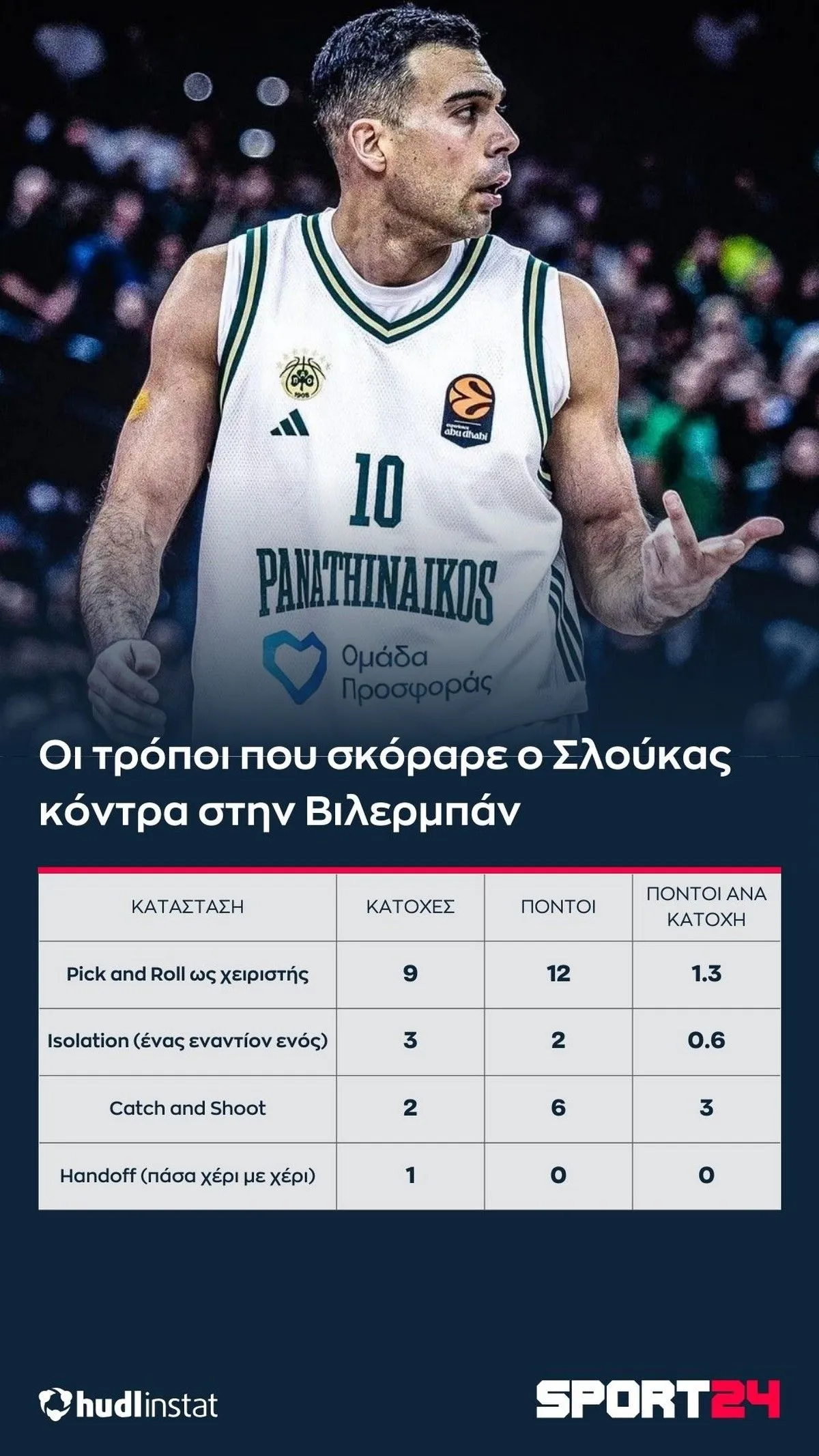 Σε μία (ακόμα) βραδιά που ο Παναθηναϊκός AKTOR παρατάχθηκε χωρίς τον Κέντρικ Ναν, ο Κώστας Σλούκας πήρε την ομάδα του από το χέρι και την οδήγησε στην νίκη, τελειώνοντας το ματς με 26 πόντους με 2/4 δίποντα, 4/5 τρίποντα, 10/10 βολές, 3 ριμπάουντ, 9 ασίστ (που έδωσαν άλλους 19 πόντους στο “τριφύλλι”), 1 κλέψιμο, 4 λάθη και το αδιανόητο +18 στο σύστημα +/- σε 28 λεπτά συμμετοχής.