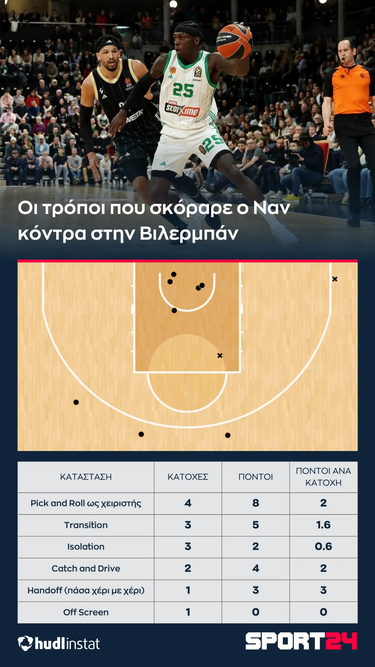Ο Στέφανος Μακρής αναλύει με τη βοήθεια του Hudl Instat την νίκη του Παναθηναϊκού AKTOR στην έδρα της Βιλερμπάν. Η κλάση των Ναν, Σλούκα, που πρόσφεραν 61 πόντους στους ”πράσινους”, η ψηλή πεντάδα με τον Μήτογλου στο 4 και το “Πλάις effect” στην επίθεση.
