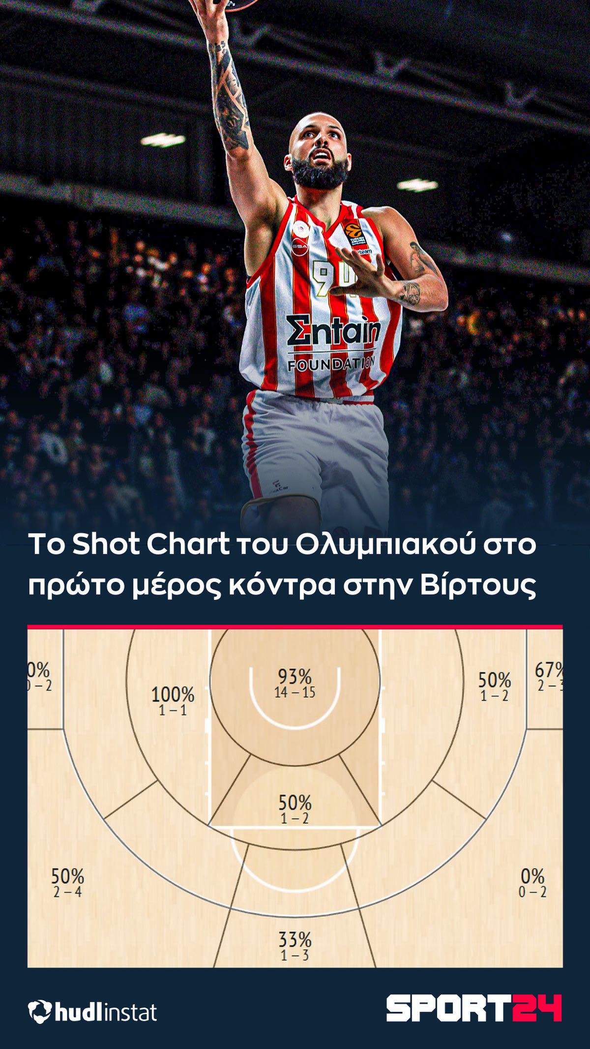 Ο Ολυμπιακός ήταν κυρίαρχος στο πρώτο μέρος με την Βίρτους. Κάθε άμυνα έδινε μία ευκαιρία για τρέξιμο στο ανοιχτό γήπεδο. Η πλέον ξεκάθαρη απόδειξη έρχεται από το εξής νούμερο: Σύμφωνα με το Hudl Instat, ο Ολυμπιακός σημείωσε συνολικά 16 πόντους σε κατάσταση transition (μετάφραση: κατάσταση αιφνιδιασμού, δηλαδή στα πρώτα 8 δευτερόλεπτα) κόντρα στην Βίρτους. Και οι 16 πόντοι ήρθαν στο πρώτο μέρος!