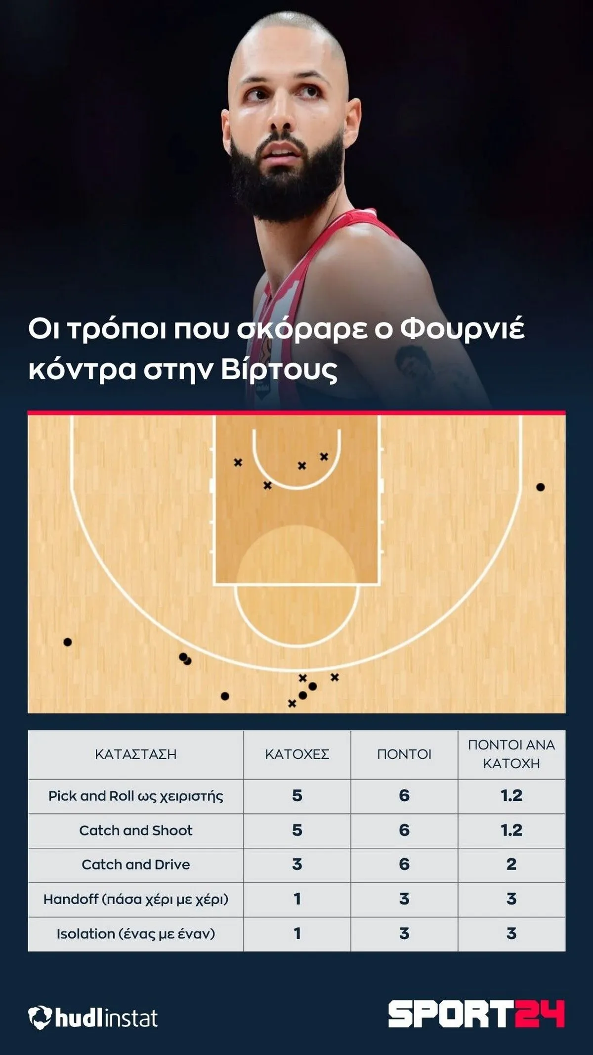 Ο Φουρνιέ πήρε πολλές φάσεις σε κατάσταση Pick and Roll, ενώ πήρε και τα σουτ που του αναλογούσαν από δημιουργία συμπαικτών του. Υπάρχει και ένα παραπλανητικό νούμερο: Ο Γάλλος δεν πιστώθηκε κάποια ασίστ. Στην πραγματικότητα όμως έδωσε ασφάλεια στον Ολυμπιακό σε κατάσταση Pick and Roll, πασάροντας στον σωστό χρόνο στον Μιλουτίνοβ ή σε συμπαίκτες του στα Hedge Out της Βίρτους (περισσότερα πάνω σε αυτό σε λίγο).