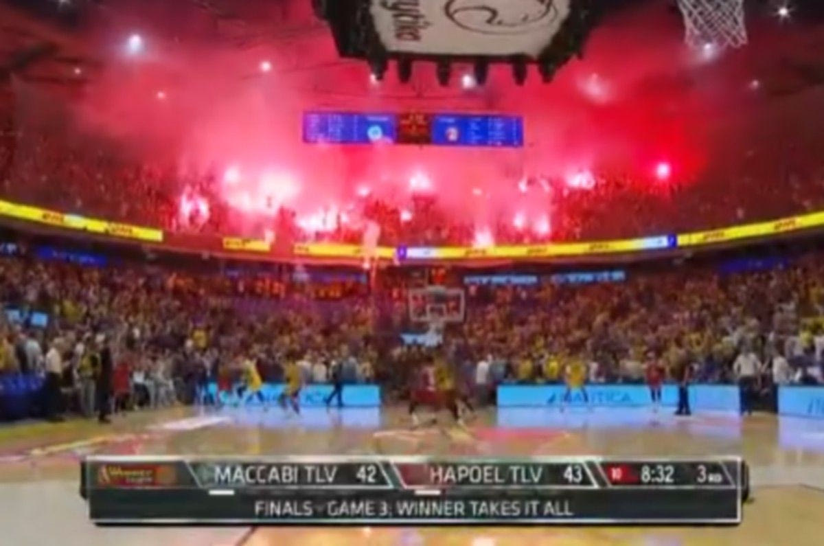 Χάος προέκυψε το βράδυ της Δευτέρας (17/6) στο Γιαντ Ελιάου, καθώς 8:28 πριν από το φινάλε της τρίτης περιόδου του καθοριστικού τελικού ανάμεσα στη Μακάμπι και τη Χάποελ Τελ Αβίβ, οπαδοί των φιλοξενούμενων άναψαν καπνογόνα και τα πέταξαν στους οπαδούς των γηπεδούχων.