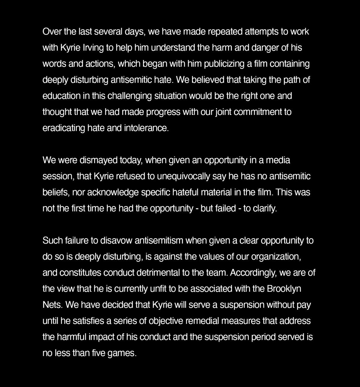 Στη διάρκεια των τελευταίων ημερών κάναμε πολλές προσπάθειες για να συνεργαστούμε με τον Καϊρί Ίρβινγκ και να τον βοηθήσουμε να καταλάβει πόσο μεγάλη ζημιά έκανε και σε πόσο κίνδυνο εξέθεσε ανθρώπους με τις λέξεις και με τις πράξεις του, οι οποίες ξεκίνησαν από μία ταινία που περιέχει βαθιά, ενοχλητικά, αντισημιτικά μηνύματα μίσους. Πιστεύαμε ότι το να πάρουμε το μονοπάτι της μόρφωσης σε αυτή τη γεμάτη προκλήσεις κατάσταση ήταν η σωστή επιλογή, πιστεύαμε ότι κάναμε πρόοδο με την κοινή μας δέσμευση για την εξάλειψη του μίσους” αναφέρει στο ξεκίνημά της η ανακοίνωση των Νετς.