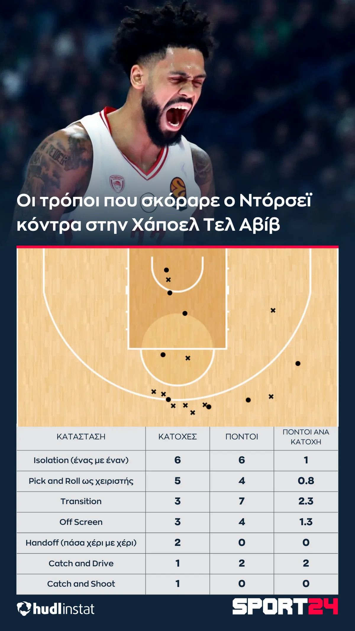 *Με κυκλάκι τα εύστοχα σουτ, με “x” τα άστοχαΟ Ντόρσεϊ κουβάλησε για μεγάλα διαστήματα τον Ολυμπιακό. Ένας παίκτης όμως που άλλαξε τα δεδομένα ήταν ο Μουσταφά Φαλ. Στο πρώτο του παιχνίδι μετά από σχεδόν 300 μέρες, ο Γάλλος ψηλός έδειξε πόση επίδραση μπορεί να έχει στο ματς ένας παίκτης που δεν επιχειρεί καν προσπάθεια.