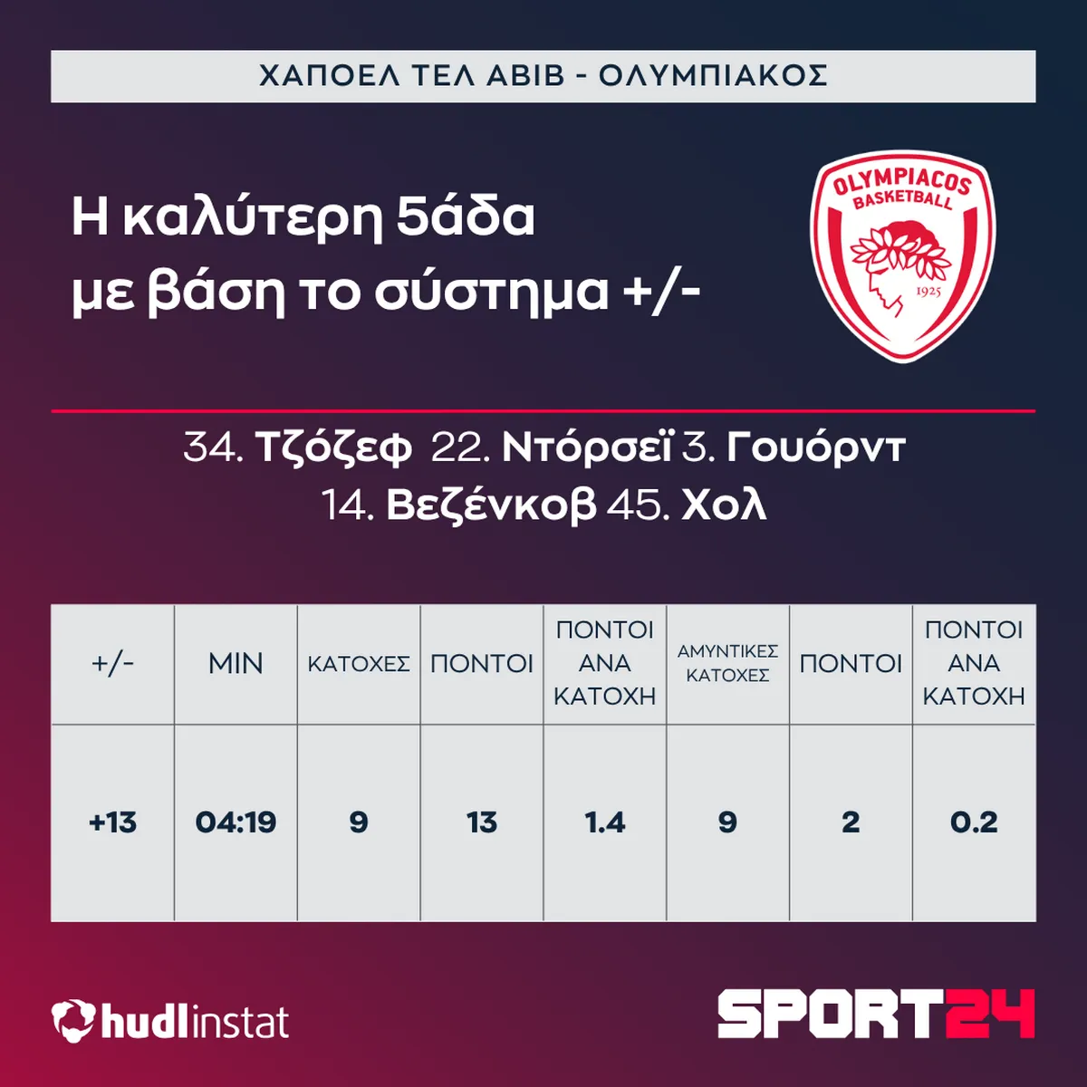 Το κερασάκι στην τούρτα για τον Ολυμπιακό ήταν βέβαια αυτό που έγινε στο τελευταίο δίλεπτο. Ήταν τότε που η Χάποελ κατέβασε το σχήμα της, περνώντας τον Μπράιαντ σε θέση πάουερ φόργουορντ και ο Ολυμπιακός απάντησε ρίχνοντας στο παρκέ ένα ψηλό σχήμα (Τζόζεφ, Ντόρσεϊ, Πίτερς, Βεζένκοβ, Φαλ). Αυτή η πεντάδα βρέθηκε στο παρκέ μόλις για 1:42 και είχε +2 το σύστημα +/-. Ήταν όμως μία πεντάδα που πήρε 4 ριμπάουντ (1 αμυντικό – 3 επιθετικά), έναντι 1 αμυντικού ριμπάουντ της Χάποελ, με αποκορύφωμα το επιθετικό ριμπάουντ και το καλάθι του Πίτερς, που κλείδωσε το ματς.