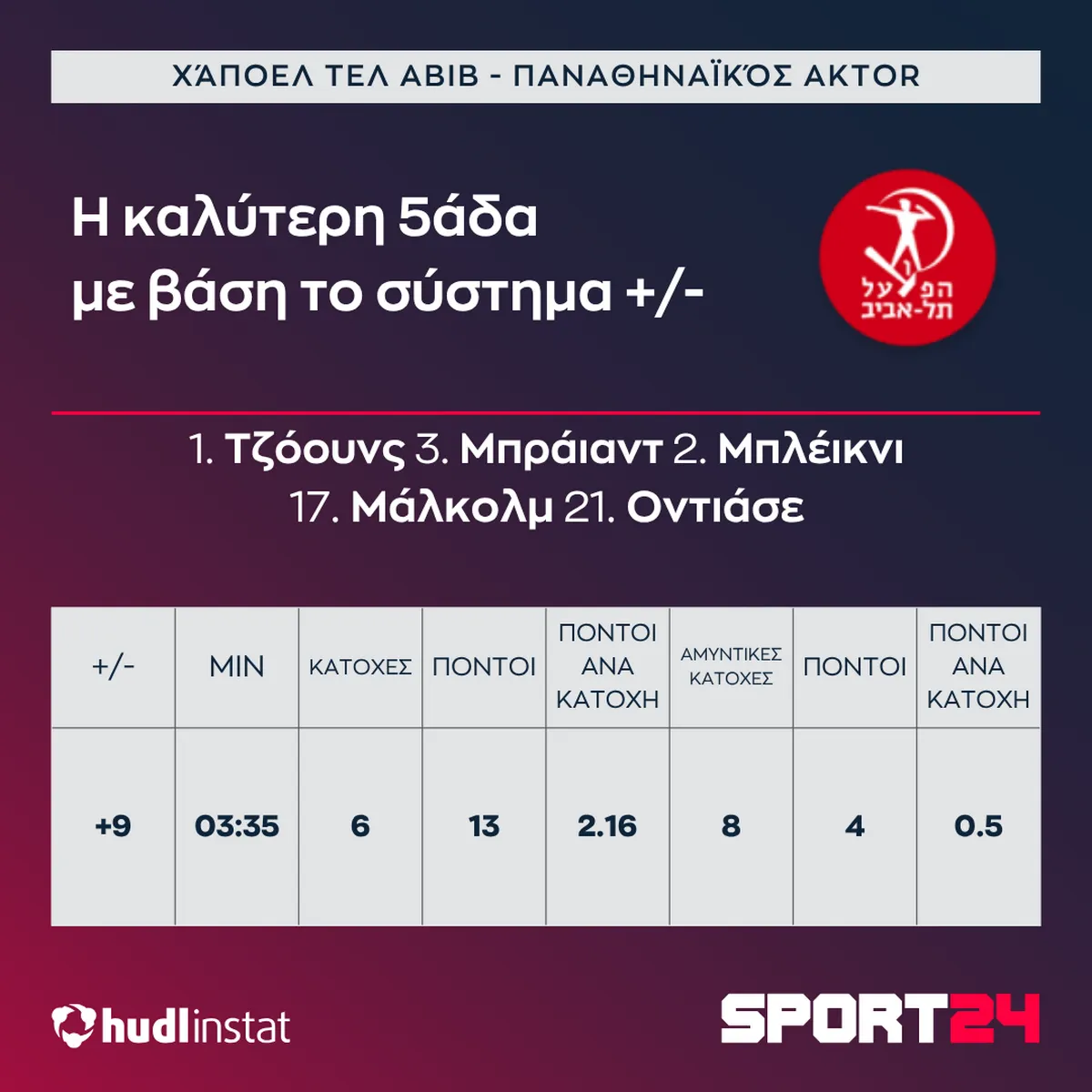 Ο αφανής ήρωας της Χάποελ πάντως ήταν ο Μάλκολμ. Ο πρώην παίκτης της Παρί είχε 10 πόντους, 6 ριμπάουντ και +6 στο σύστημα +/-. Σύμφωνα ωστόσο με το Hudl Instat, η Χάποελ είχε συνολικά +11 στα 21 λεπτά που χρησιμοποιήθηκε σε θέση πάουερ φόργουορντ.