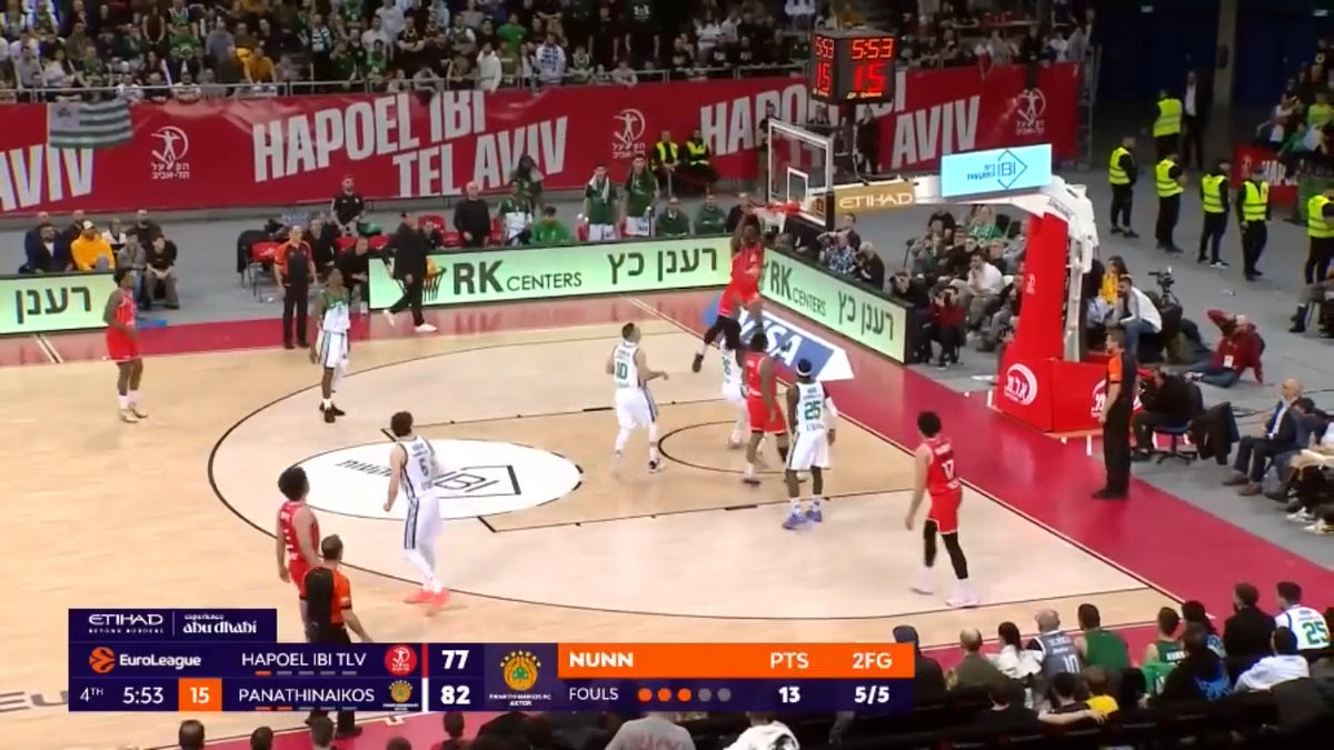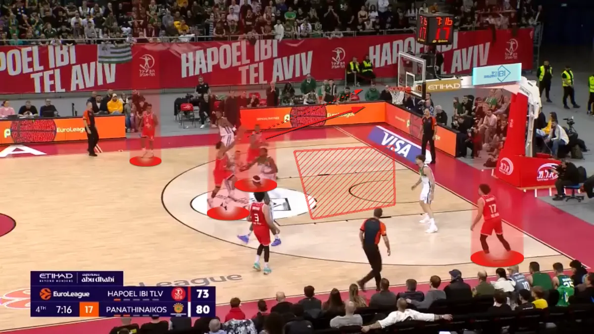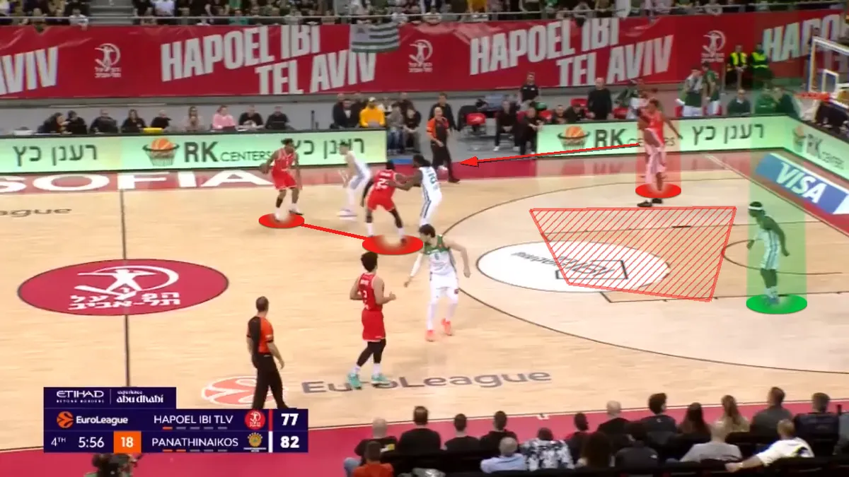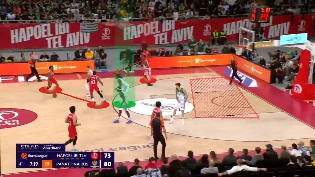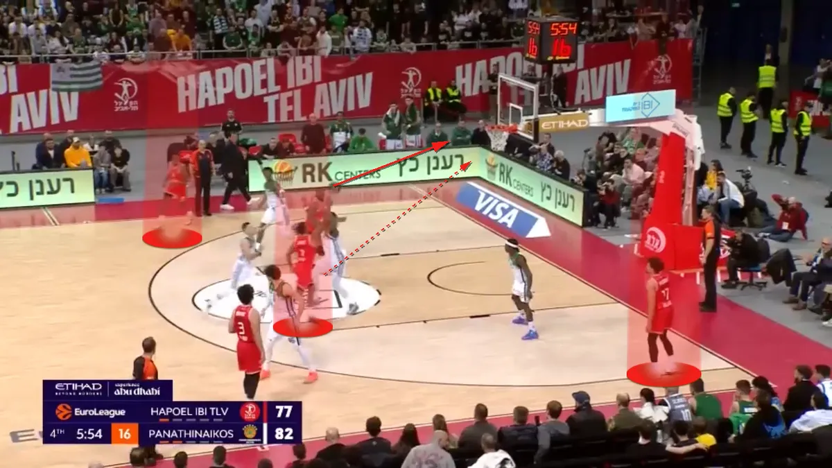 Αυτά τα 3.5 λεπτά της συγκεκριμένης πεντάδας έκαναν άνω-κάτω το παιχνίδι. Σε αυτό το διάστημα η Χάποελ δεν έχασε σουτ, έχοντας 4/4 δίποντα, 1/1 τρίποντο και 2/2 βολές. Και όλα ξεκινούσαν με τα quick Pick and Roll των Τζόουνς-Οντιάσε (μετάφραση: Pick and Roll που στήθηκαν στα πρώτα δευτερόλεπτα μίας επίθεσης), που έβρισκαν σε ανισορροπία την “πράσινη” άμυνα. Ιδού ένα παράδειγμα: