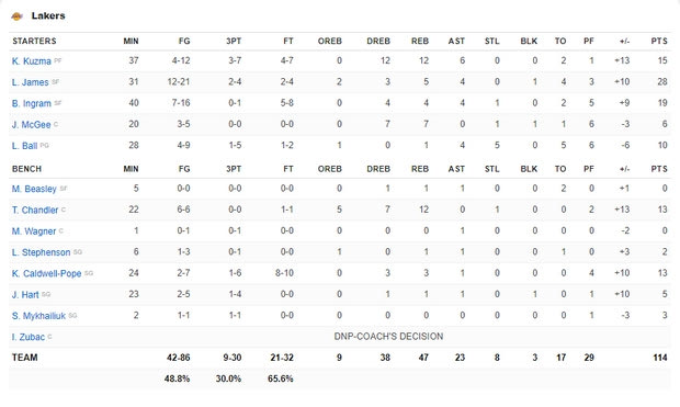 Άξιος συμπαραστάτης του ΛεΜπρόν ήταν ο Μπράντον Ίνγκραμ με 19 πόντους, με τον Κάιλ Κούζμα να προσθέτει 15 πόντους και τον Τάισον Τσάντλερ 13 πόντους και 12 ριμπάουντ.