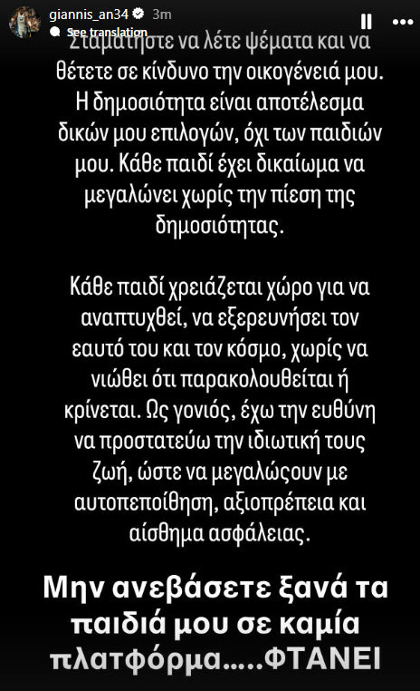 Ο Γιάννης Αντετοκούνμπο ξέσπασε μέσω Instagram σχετικά με τα πρόσφατα δημοσιεύματα που αφορούσαν τα παιδιά του, ενώ ζήτησε να μην ανεβάσει κανείς ξανά τα παιδιά του σε καμία πλατφόρμα, ώστε να προστατεύσει την ιδιωτική τους ζωή.