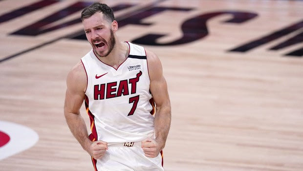 Miami Heat guard Goran Dragic (7) celebrates after sinking a basket against the Boston Celtics during the second half of an NBA conference final playoff basketball game, Thursday, Sept. 17, 2020, in Lake Buena Vista, Fla. (AP Photo/Mark J. Terrill) AP Photo/Mark J. Terrill