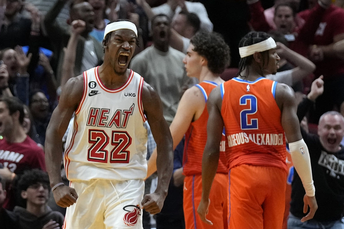 Ο Τζίμι Μπάτλερ πανηγυρίζει στον αγώνα με τους Θάντερ AP Photo/Wilfredo Lee