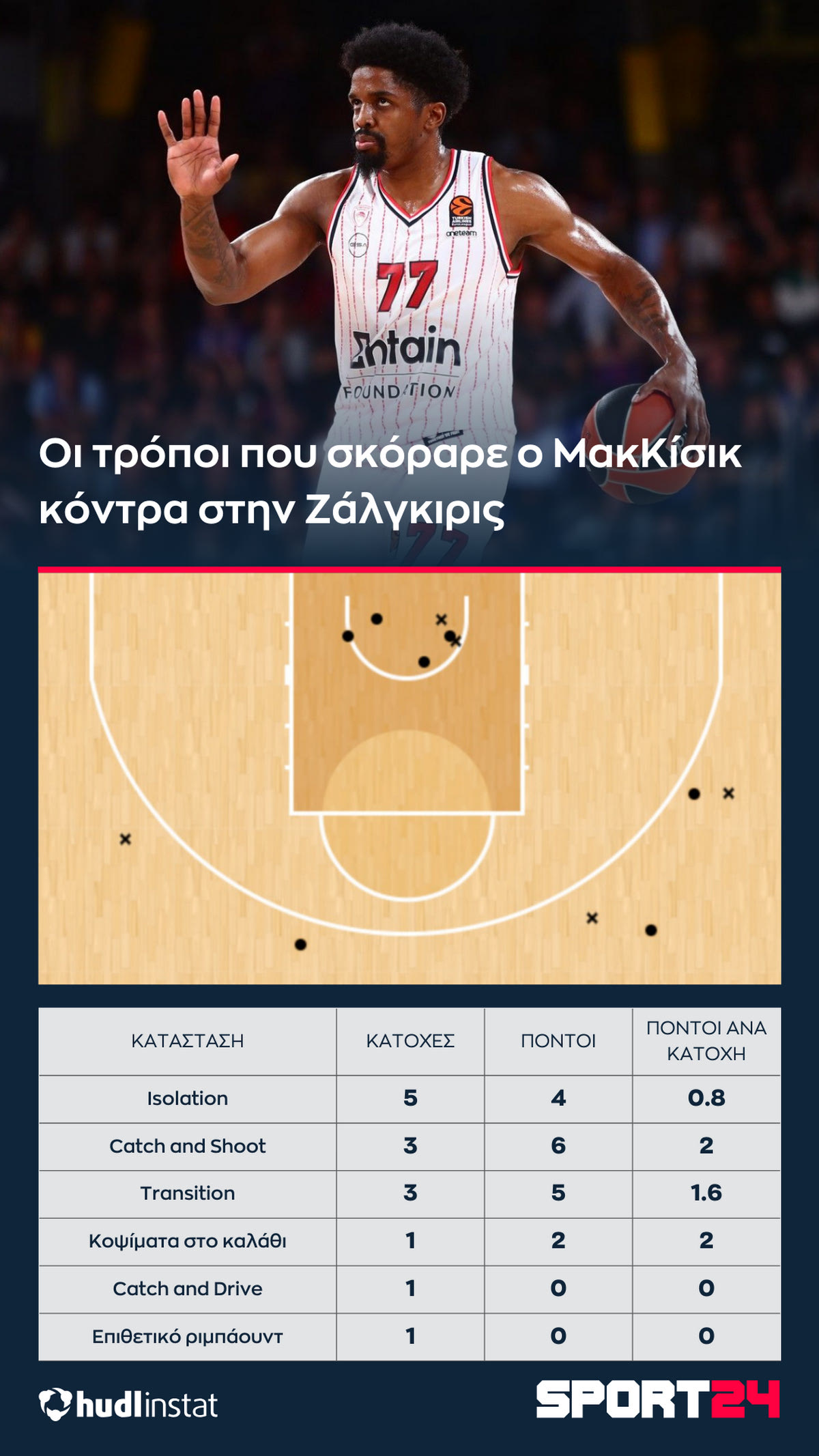 Την αρχή για τον Ολυμπιακό έκανε ο ΜακΚίσικ. Σε ένα πρώτο μέρος που ο Ολυμπιακός ψαχνόταν, ο Αμερικανός ήταν αυτός που με προσωπικά καλάθια βοήθησε τον Ολυμπιακό να διατηρήσει την επαφή του με το σκορ, δίνοντας ανάσες στην 2η περίοδο, κάνοντας τον γνωστό του θόρυβο.