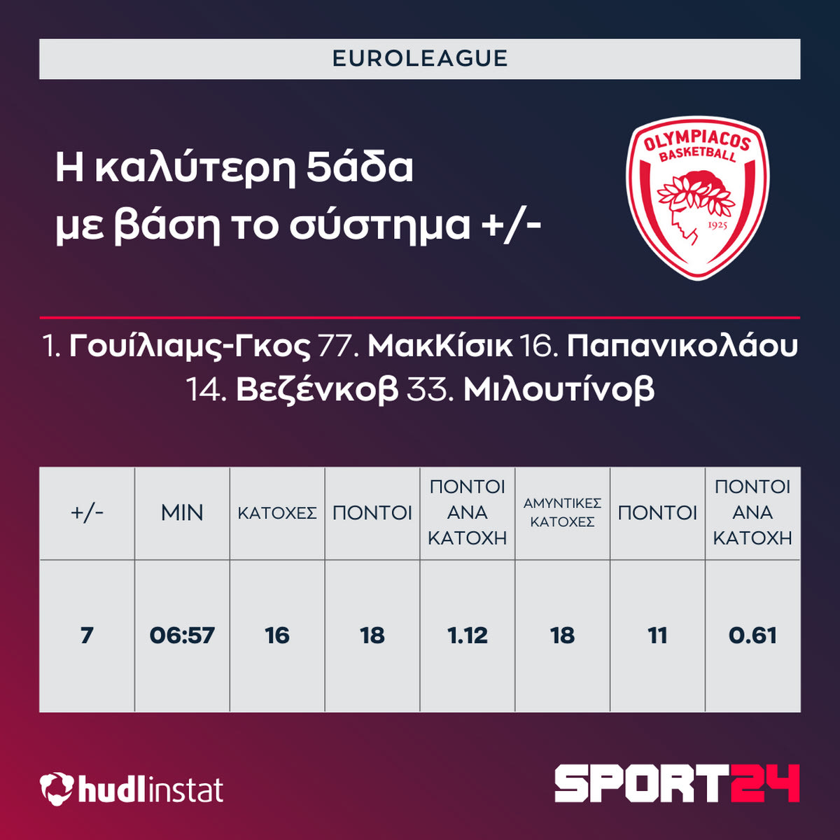 Ο Ολυμπιακός έβαλε 92 πόντους για να νικήσει. Ενώ όμως δέχθηκε 85 – σε μία κακή επίδοση για τα δεδομένα του – ηταν η άμυνά του αυτή που τον βοήθησε να γυρίσει στο ματς από το -14. Κι αυτό γιατί δέχθηκε μόλις 33 πόντους στο δεύτερο μέρος, όταν στο πρώτο μέρος είχε δεχθεί 52. Ο Ολυμπιακός άλλαξε το επίπεδο της έντασης που έβγαλε στο παρκέ. Άλλαξε όμως και την άμυνά του, κάτι που οφείλει στην πεντάδα που έφερε για τα καλά τούμπα το παιχνίδι: