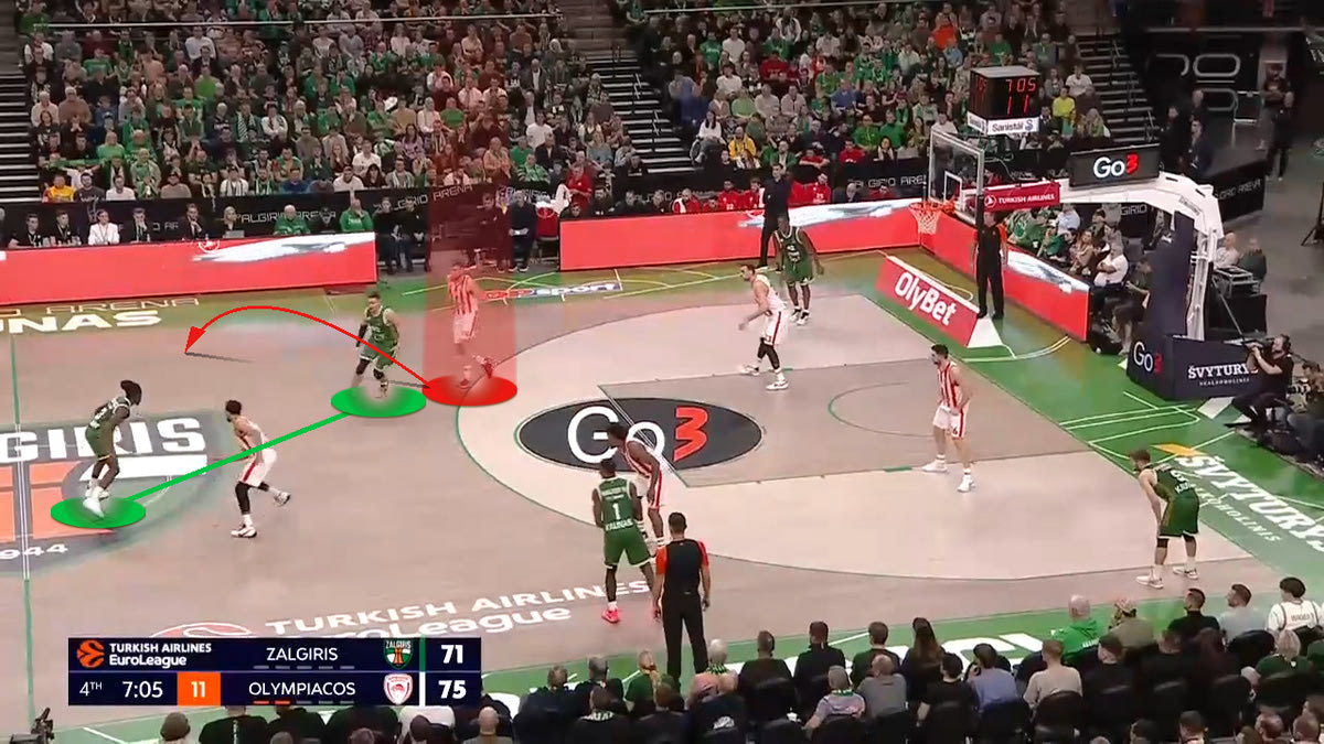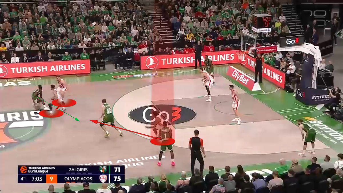 Οι “ερυθρόλευκοι” είδαν τον Σίλβεν Φρανσίσκο (22 πόντοι, οι 20 στο πρώτο μέρος) να κάνει ζημιά στο πρώτο μέρος στο Pick and Roll που έστηνε με τα 4αρια της ομάδας του για να σημαδέψει τους Βεζένκοβ και Πίτερς, χτυπώντας την άμυνα με αλλαγές των “ερυθρολεύκων”. Από την 3η περίοδο κι έπειτα λοιπόν αποφάσισαν να το αλλάξουν αυτό, επιλέγοντας να αμυνθούν με δυναμικό Hedge Out, που συχνά γινόταν Blitz (μετάφραση: Παγίδα). Ο Ολυμπιακός ήθελε να διώξει την μπάλα από τα χέρια του Γάλλου και να τον οδηγήσει σε λάθος και τα κατάφερε. Ιδού ένα παράδειγμα: