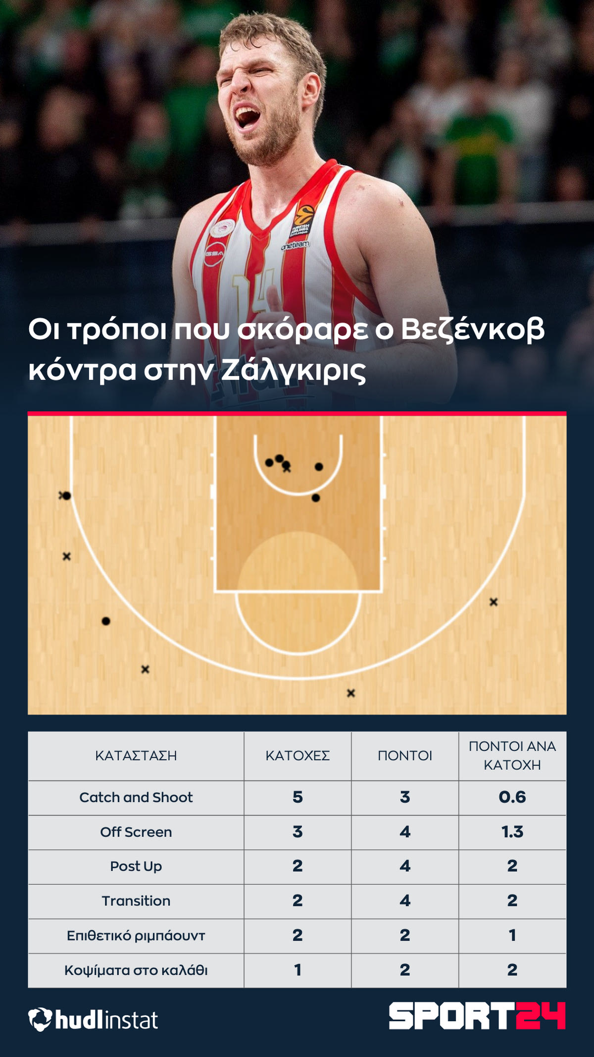 Έχει γίνει πολλές φορές αναφορά στην ικανότητα του Βεζένκοβ να δημιουργεί κάτι από το τίποτα, χωρίς καν να ντριμπλάρει. Κόντρα στην Ζάλγκρις πραγματοποίησε την πιο… Βεζένκοβ εμφάνιση της χρονιάς, κάτι που φαίνεται από ένα απλό νούμερο: Σημείωσε 24 πόντους χωρίς να κάνει ντρίμπλα!