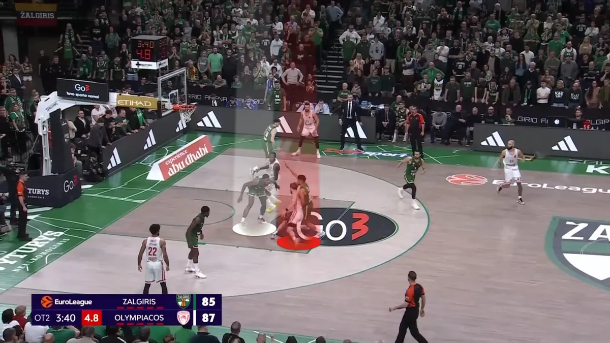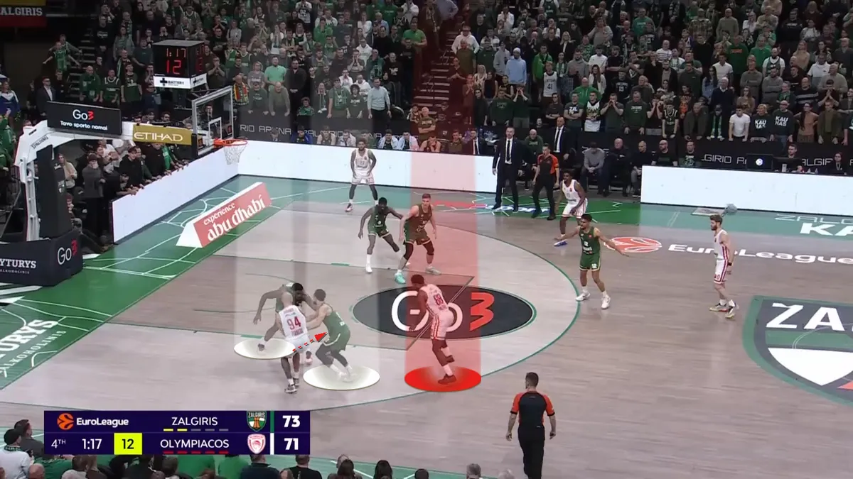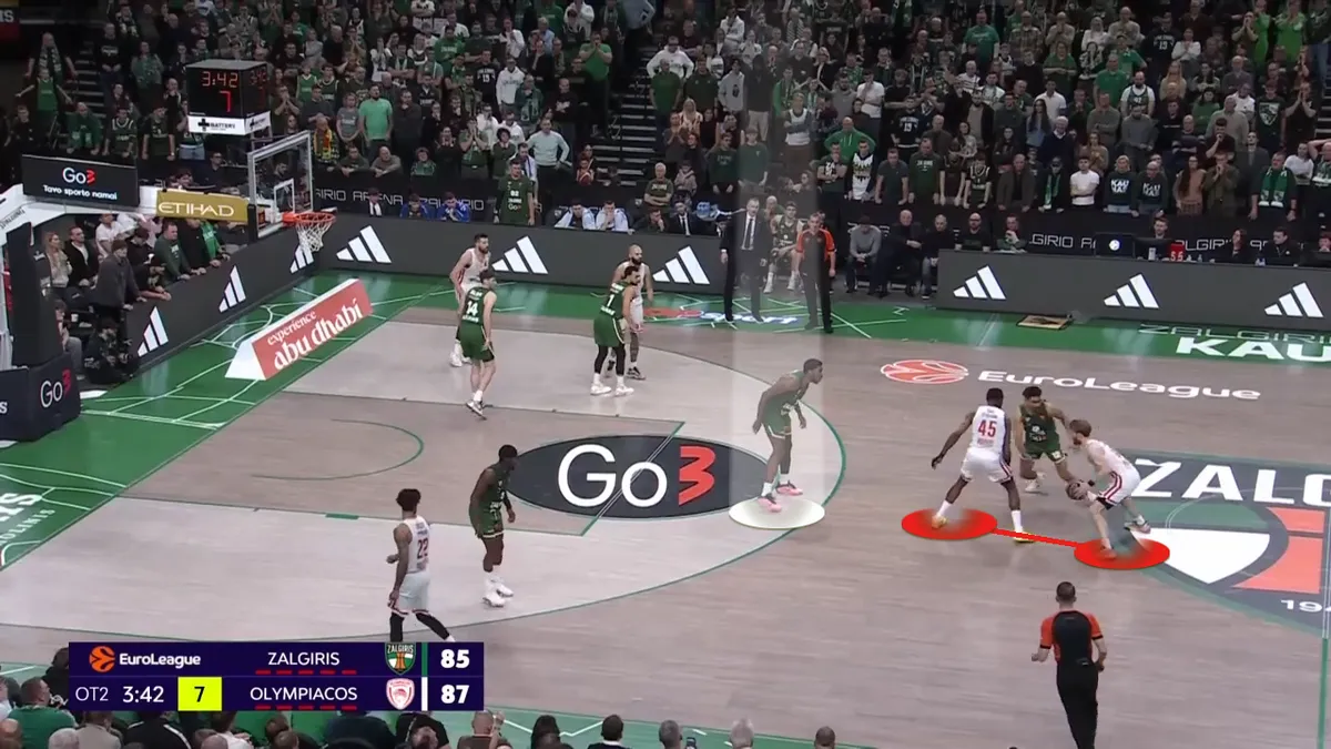 Σύμφωνα με το Hudl Instat, ο Ολυμπιακός ετρεξε συνολικά 26 Pick and Roll με σουτ του χειριστή, παίρνοντας μόλις 9 πόντους. Όλοι αυτοί οι πόντοι ήρθαν από τον Φουρνιέ, σε 14 κατοχές. Κοινώς, στις άλλες 12 κατοχές που έπαιξαν Pick and Roll οι “ερυθρόλευκοι” με σουτ του χειριστή πήραν 0 πόντους. Οι – εκτός Φουρνιέ – περιφερειακοί ήταν είτε άστοχοι, είτε διστακτικοί κόντρα στην άμυνα της Ζάλγκιρις στο Pick and Roll. Ιδού μία ακόμα φάση: