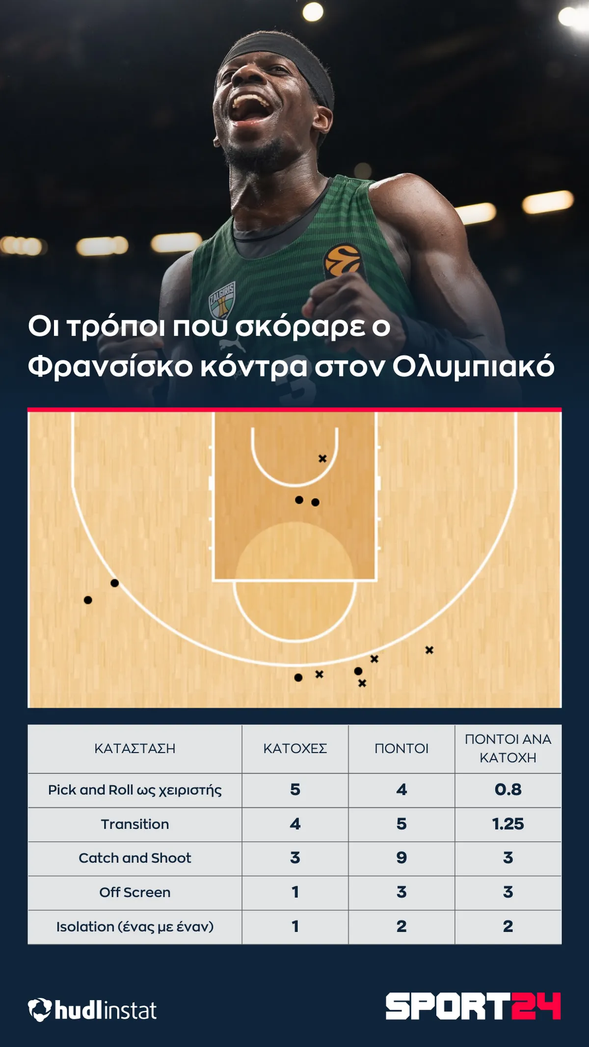 *Με κυκλάκι τα εύστοχα σουτ, με “x” τα άστοχαΟ Ολυμπιακός ήθελε να διώξει την μπάλα από τα χέρια του Φρανσίσκο, για αυτό ο Γάλλος δεν σκόραρε πολύ σε κατάσταση Pick and Roll. Την ίδια στιγμή, ωστόσο, οι 6 από τις 7 ασίστ του διεθνή γκαρντ (που μεταφράστηκαν σε 14 πόντους) ήρθαν έπειτα από Pick and Roll που έστησε, βγάζοντας ελεύθερα σουτ στους συμπαίκτες του.
