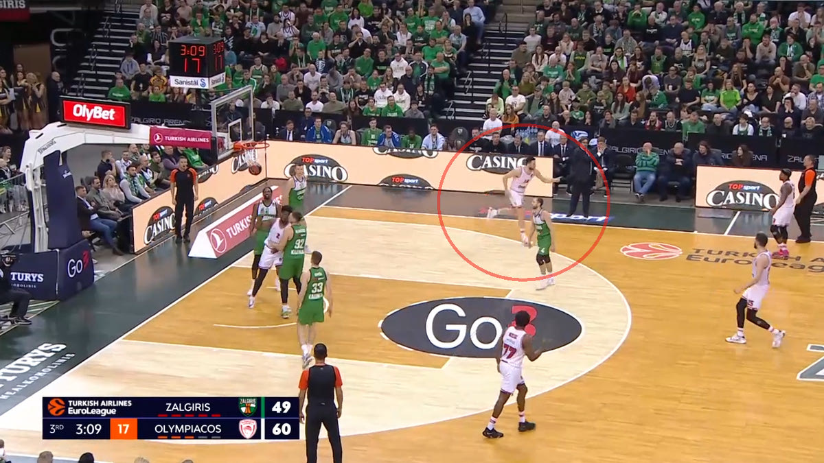 2. Σε ένα τάιμ-άουτ η κάμερα της EuroLeague έπιασε τον Γιώργο Μπαρτζώκα να λέει στον Ράιτ να τρέχει δυνατά από τον κεντρικό διάδρομο στο transition για να βρει το κενό. Ένα μόνιμο άγχος των ψηλών είναι ότι μπορεί να τρέχουν… τσάμπα. Να κάνουν ένα σπριντ που θα πάει χαμένο, αφού δεν θα πάρουν την μπάλα. Ο Ράιτ είναι καινούργιος στον Ολυμπιακό. Είναι σημαντικό να ξέρει πως αν τρέξει στο ανοιχτό γήπεδο θα πάρει την μπάλα, θα ανταμειφθεί για αυτό. Μόλις συμβεί αυτό, θα τρέξει και σε άλλη φάση, ενώ θα είναι πιο συγκεντρωμένος στην άμυνα.